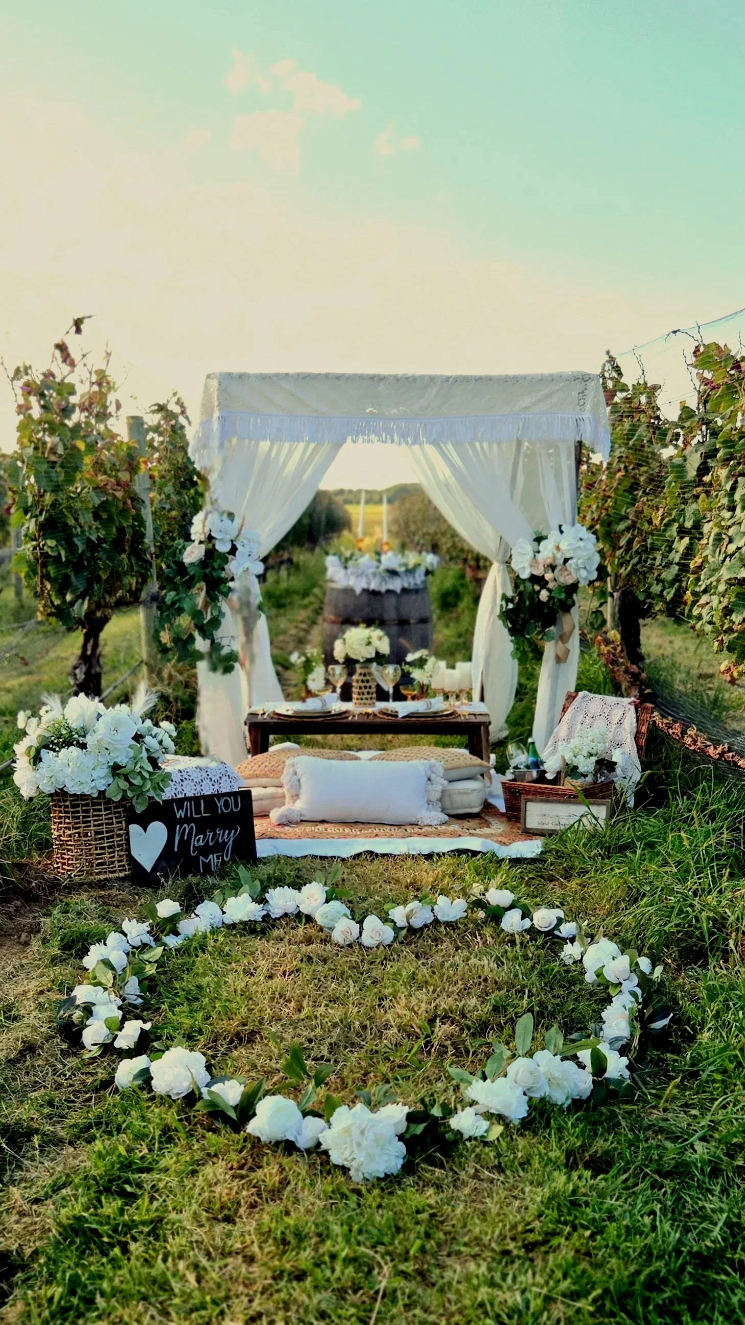 Our proposal picnics are thoughtfully designed to turn one of life’s biggest questions into an unforgettable, picture-perfect moment. Each experience includes a fully styled picnic setup, a fresh floral bouquet, a romantic faux floral heart, and a beautifully curated grazing spread—carefully arranged to feel intimate, elegant, and effortless. In collaboration with Island Gatherings Picnic Co, we bring your vision to life at a variety of beautiful locations, whether it’s a sunset beach, a scenic vineyard, or the comfort and privacy of your home. Every detail is handled with care so you can stay present, enjoy the moment, and focus on what matters most—asking the question and celebrating the “yes.”